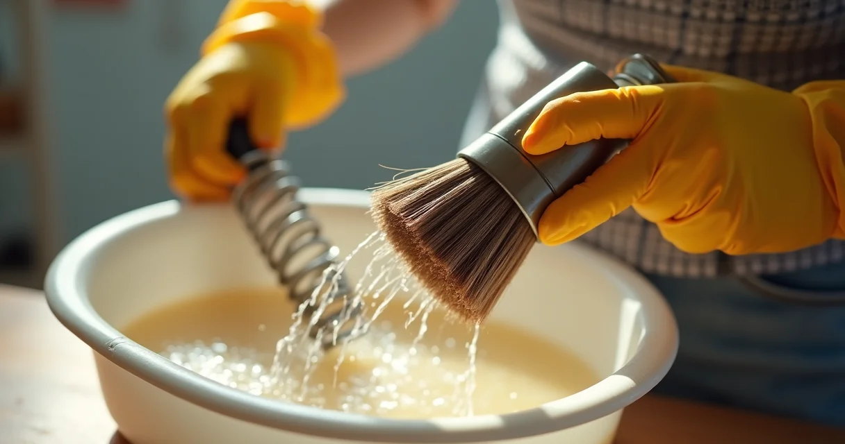 3. Passo 3: Escovando a Ferrugem – Passado o tempo de molho, retire a mola do vinagre. Você já vai notar que boa parte da ferrugem se soltou. Agora, pegue uma escova de aço ou uma escova de dentes velha e comece a esfregar a mola com vigor. O objetivo é remover todos os resíduos de ferrugem soltos e a pasta que se formou. Se a ferrugem estiver mais teimosa, você pode fazer uma pasta com bicarbonato de sódio e um pouco de água (ou suco de limão, para um poder extra em peças pequenas) e aplicar nas áreas mais afetadas antes de esfregar.