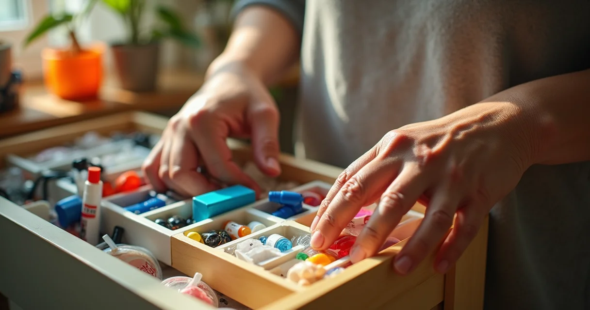 O primeiro passo exato? Pegue uma caixa de sapatos vazia. Ela vai ser sua estação temporária enquanto você organiza. Jogue tudo que é ‘cola e adesivo’ lá dentro e comece a triagem. Em 15 minutos, o caos começa a fazer sentido.