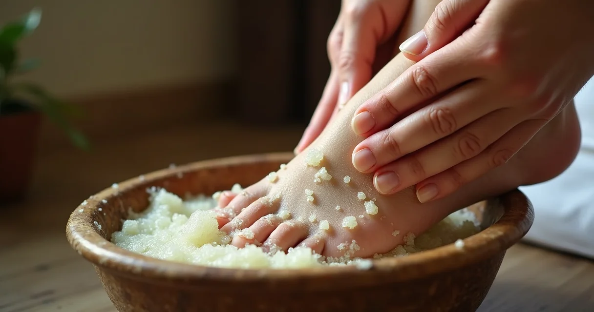 Essa é clássica e super eficaz! O açúcar é um esfoliante natural que remove as células mortas suavemente, enquanto o óleo de coco hidrata profundamente. Misture 2 colheres de sopa de açúcar (pode ser o mascavo para um poder extra) com 1 colher de sopa de óleo de coco. Massageie nos pés úmidos e enxágue.