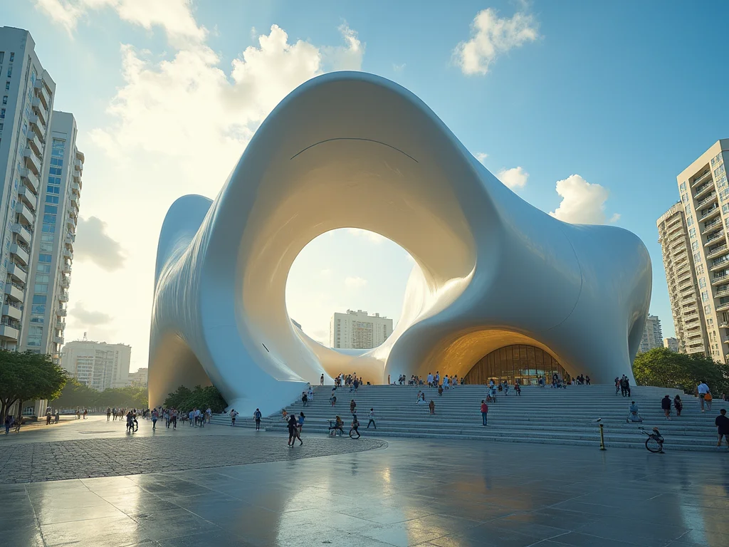 Detalhe da arquitetura externa do Museu do Amanhã, destacando as linhas orgânicas e a cobertura com painéis solares integrados, refletindo a luz natural.