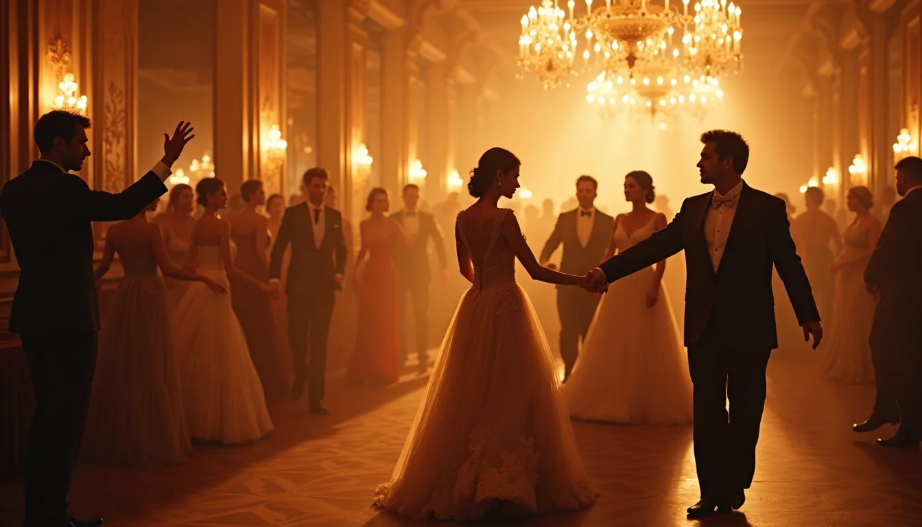 Uma cena de dança em um salão iluminado por velas, com casais girando em vestidos esvoaçantes e uniformes militares, o reflexo das luzes no piso de madeira.